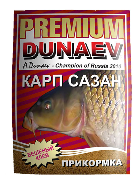 Прикормка на карпа и сазана серии «Премиум» от компании DUNAEV – крупнофракционная смесь, рассчитанная на ловлю карпа. Фракция помола 0,3-2 см, встречаются кусочки бисквитов до 2-3 см. Обладает сильной клейкостью и практически не создает мути в точке ловли. Производится с различными карповыми ароматами: «скопекс», «сладкая кукуруза», «подсолнечный жмых», и т.д.